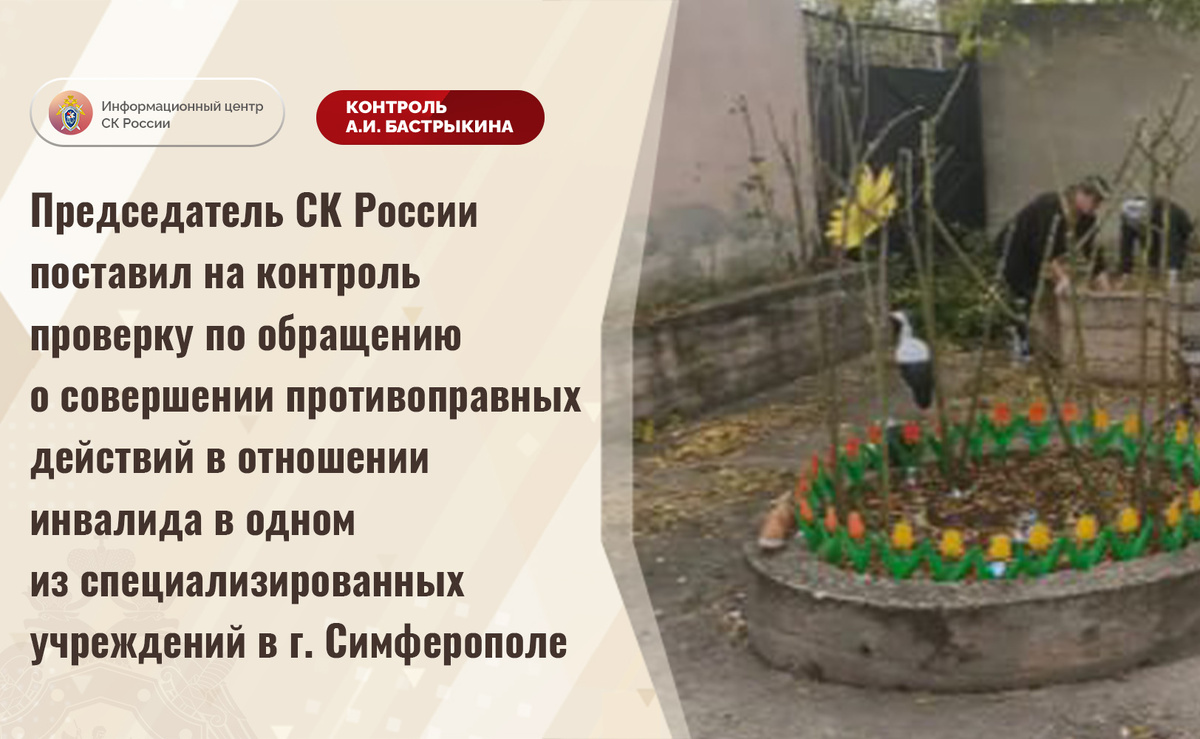 Председатель СК России поставил на контроль проверку по обращению о совершении противоправных действий в отношении инвалида в одном из специализированных учреждений в г. Симферополе В Информационный центр СК России обратилась жительница Республики Крым. Она сообщила о совершении противоправных действий в отношении ее пожилой родственницы, являющейся инвалидом, в одном из специализированных учреждений в городе Симферополе. В сентябре текущего года семья заявительницы заключила договор с целью реабилитации и ухода за женщиной. Однако через месяц на теле пенсионерки обнаружены многочисленные повреждения. Кроме того, обратившаяся полагает, что жизненно необходимые лекарственные препараты инвалиду не предоставлялись. В ГСУ СК России по Республике Крым и городу Севастополю по поступившему обращению начата процессуальная проверка. Председатель Следственного комитета Российской Федерации Александр Иванович Бастрыкин поставил ход процессуальной проверки на контроль в центральном аппарате ведомс