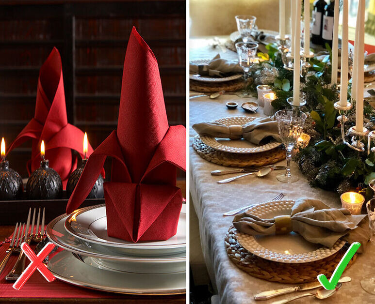 Украшенный статуэтками, мишурой, огромными елками стол — это же ужасно неудобно! Гостям будет элементарно сложно взять салат, который стоит за горами декора. Да и смотрится все это, мягко говоря, не очень.