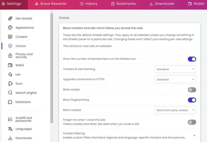 Откройте гамбургер-меню и выберите Настройки. На левой панели откройте Щиты. Настройте, насколько агрессивной должна быть блокировка. Я считаю, что в большинстве случаев лучше всего работает Стандарт. Конечно, для пользовательской блокировки/фильтрации нажмите Фильтрация контента в настройках Shields и установите свои параметры.