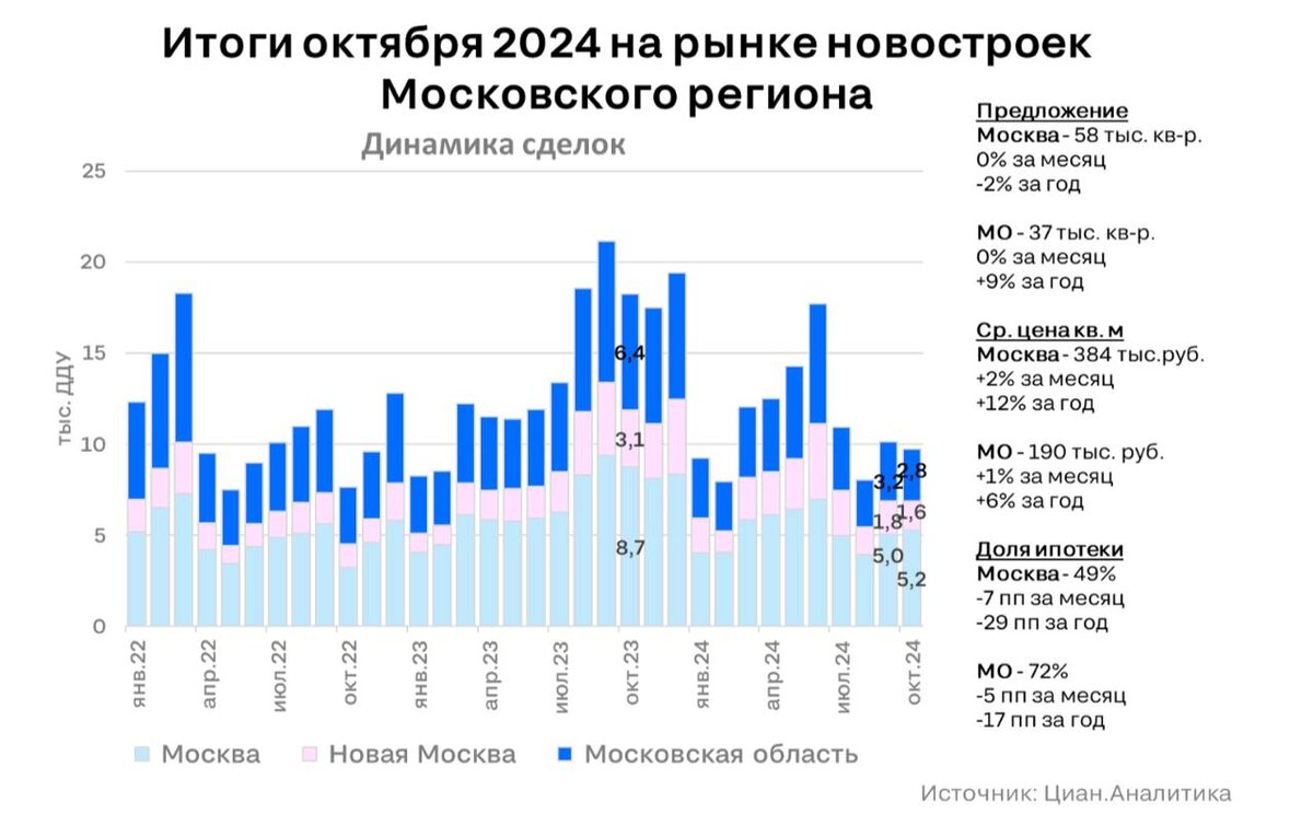 В октябре 2024 года в Московском регионе было зарегистрировано 9,7 тысяч сделок с квартирами и апартаментами в новостройках, что на 4% меньше, чем в предыдущем месяце, и на 47% меньше, чем в прошлом году.