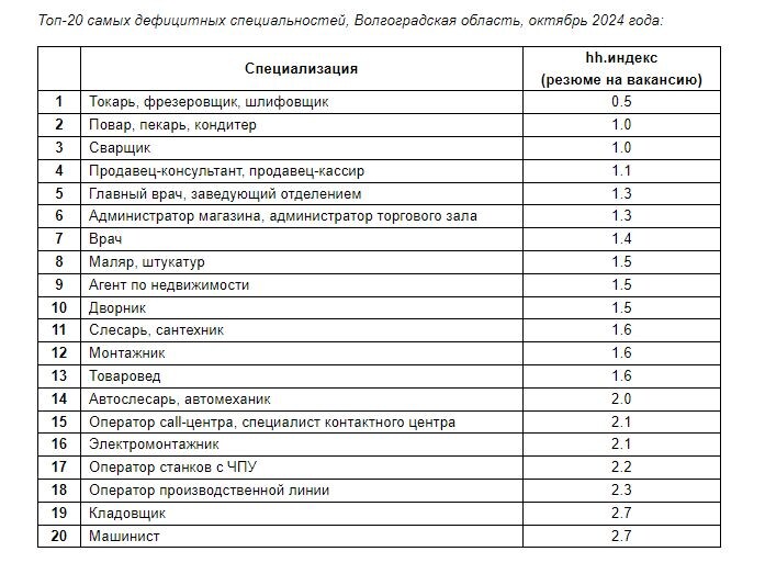 Такими данными поделилась служба исследований онлайн-платформы по поиску работы и сотрудников hh.ru. По-прежнему в почете рабочие специальности. По итогам октября 2024 года в топ-5 самых дефицитных сотрудников в Волгоградской области вошли токарь, фрезеровщик, шлифовщик, повар, пекарь, кондитер, сварщик, продавец, главврач, заведующий отделением.