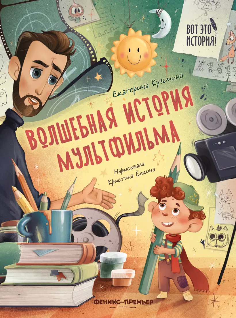 Автор «Волшебной истории мультфильма» — киновед и кинокритик Екатерина Кузьмина. Когда эксперт берётся за детский текст о своей профессии, часто случаются сложности и перекосы: автор перегружает текст фактами, пишет сухо и неинтересно, история не складывается логически и т. д. Поэтому особенно приятно, когда экспертная книга для детей получается живой и яркой — когда маленький читатель и сам может заметить ее на полке и заинтересоваться. Какие сильные стороны у «Волшебной истории мультфильма»? Во-первых, автор придумал классную комбинацию персонажей. Да, это «просто» эксперт и «просто» малыш, идеальный слушатель, который не перебивает, не отвлекается, да еще и вопросы задает один за другим. Но это мог быть, допустим, папа и сын или дядя и племянник, учитель и ученик; а Кузьмина предлагает художника и персонажа, им самим нарисованным. Оригинальный ход. И сразу два волшебных допущения: оживший персонаж и механика перемещения героев. Оба приёма рифмуются с темой мультипликации. Кадры смен
