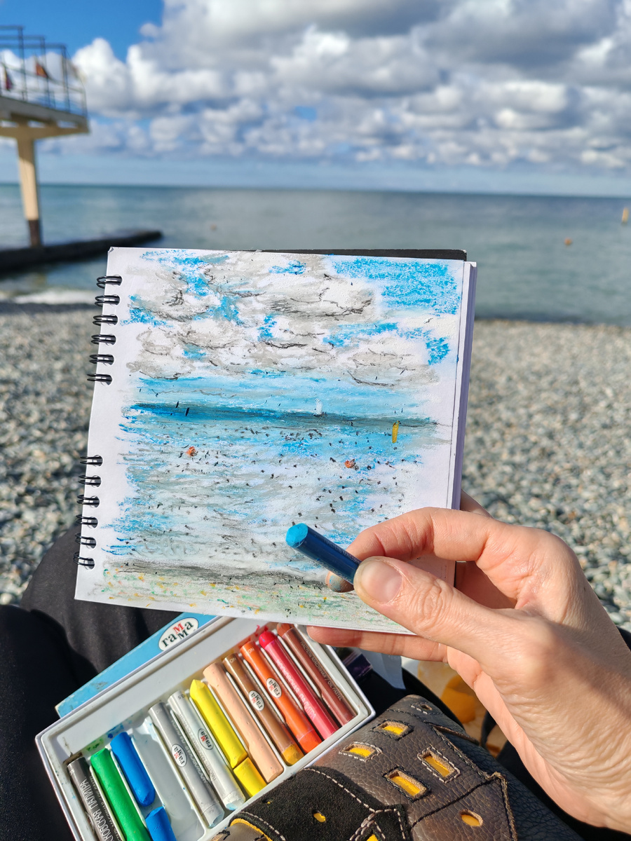 Сели и мы посидеть на берегу - послушать шум моря, подставить лицо солнышку, порисовать и поиграть.