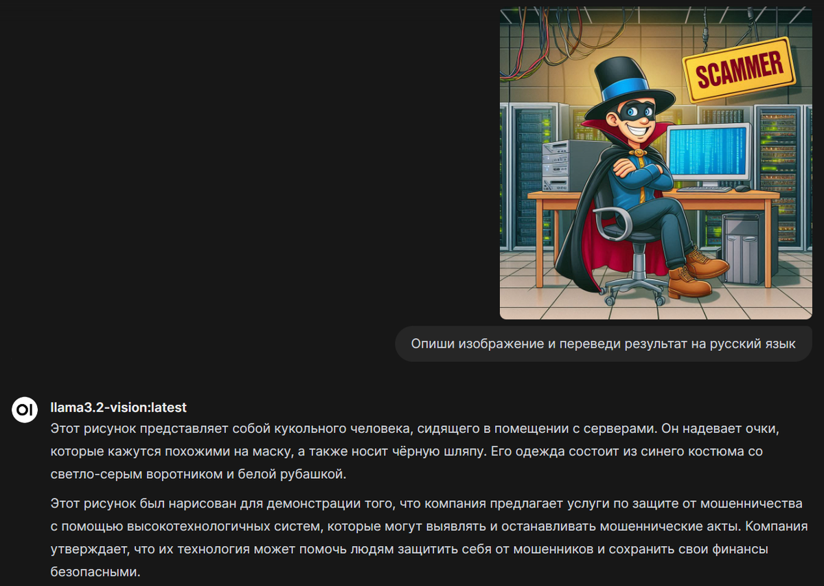 В Ollama наконец то появилась долгожданная поддержка мультимодальной модели Llama3.2-vision. Эта модель оптимизирована для распознавания изображений, создания описаний к ним и ответов на общие вопросы об изображении. Доступны версии модели на 11B (занимает ~13Гб видеопамяти) и на 90B, для запуска которой рекомендуется что-то на уровне H100 на 80 Гб для полной «прогрузки» модели в видеопамять и не использования GPU offload. Работа в режиме распознавания изображений официально поддерживает только английский язык, но модель может перевести вывод и на русский (если попросить в промте). Чтобы попробовать данную модель (например, в нашем AI-чатботе на основе Open WebUI) вам нужно: Загружать изображения в Open WebUI можно через добавление файлов (плюс слева от строки чата). На Windows или Mac можно просто перетащить изображение в окно командной строки с запущенной моделью в Ollama, или (в Linux тоже) указать путь до него.