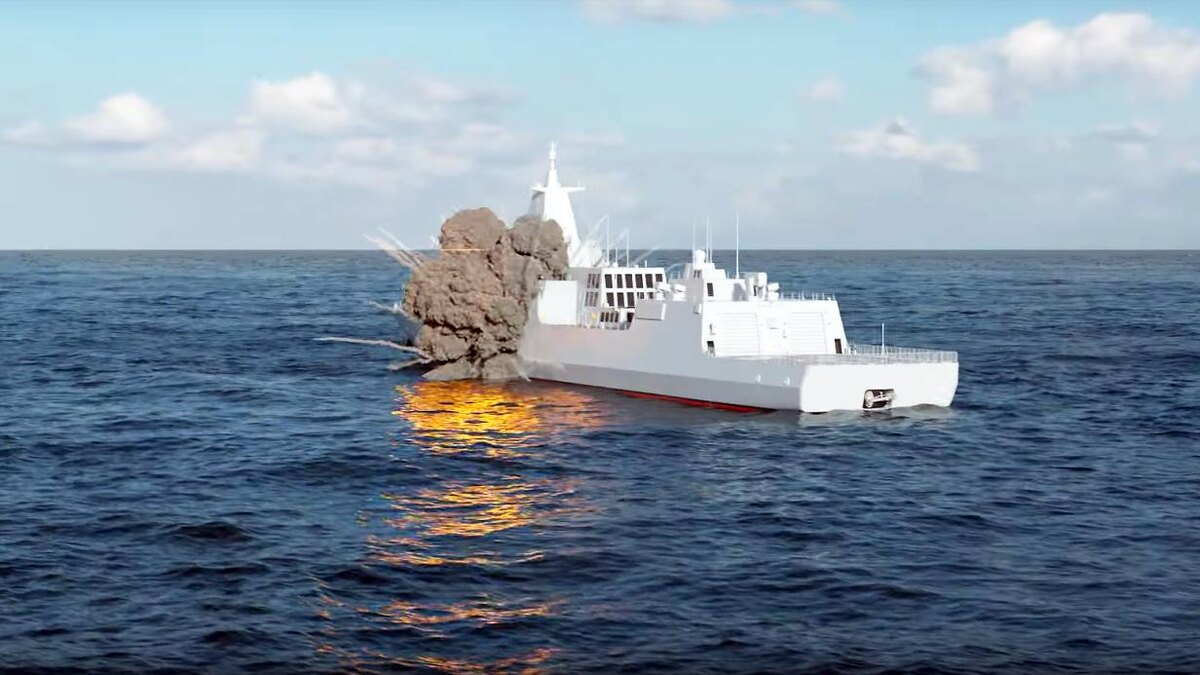 SM40 направляется к военному кораблю и врезается в него. Вместо типовой модели фрегата или корвета ракета поражает эскадренный миноносец типа 055 (так называемый Тип 055).