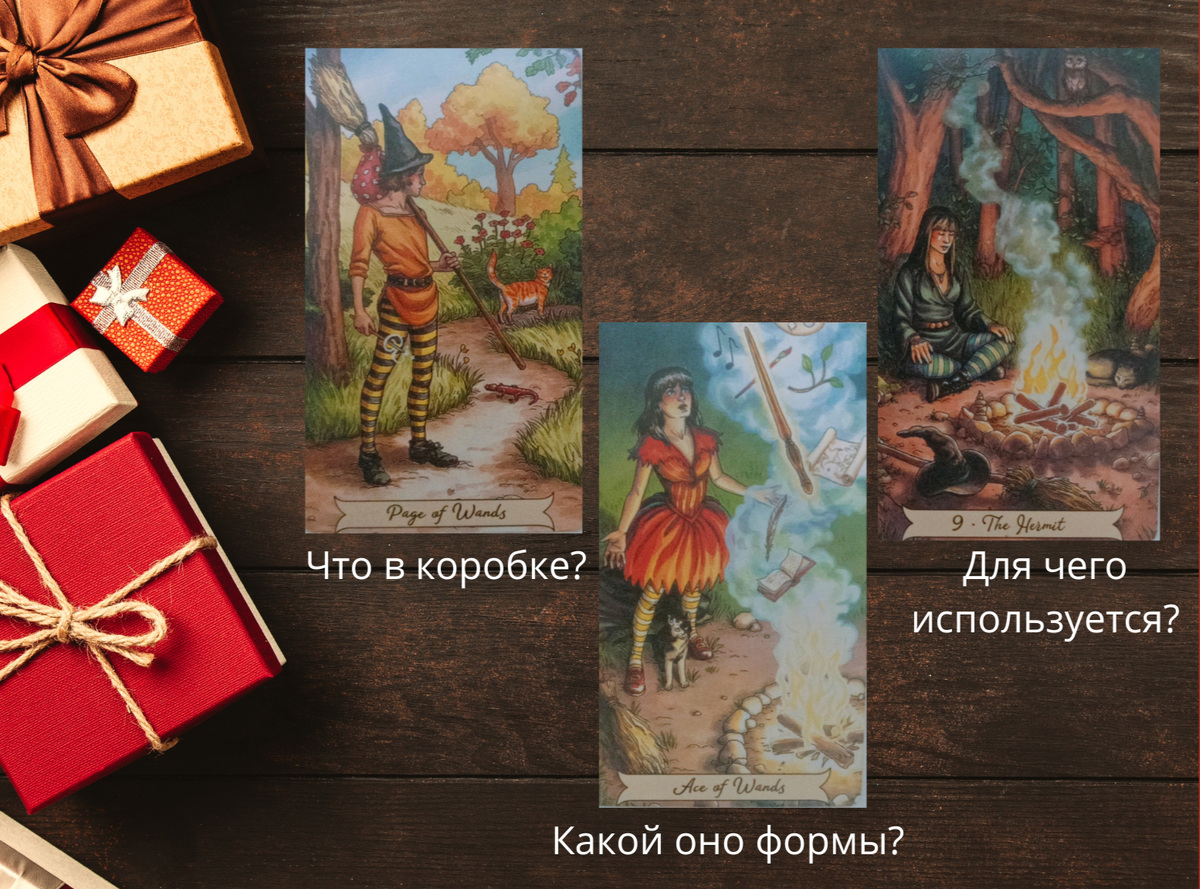 Тарологи тоже люди и любят развлечения, а если развлечения предполагают использование карт Таро - вдвойне приятно :) Кто-то, не обязательно еще один таролог, прячет что-то в коробку. Ваша задача - догадаться что в ней. Колоду можно выбрать на ваше усмотрение и задавать любые вопросы, в любом количестве, главное самому потом не запутаться. Итак, моя коллега спрятала что-то в небольшой коробочке 10*10*10 см, попробуем выяснить, что там :) У меня три вопроса: Что в коробке? - Паж Жезлов. Жезлы - социальная масть, связанная с общением и коммуникации. В этой колоде Паж собрался в путь - это что-то, что человек берет в дорогу, или, если выходит из дома по каким-то делам, и связано с общением и взаимодействием с людьми. Какой оно формы? - Туз Жезлов. Что-то в форме палки :) Пока идей нет... Для чего используется? - Отшельник. Это используется для расслабления и возможности побыть одному, погрузиться в себя. Получается два противоположных значения, одно - для коммуникации, второе - для одино