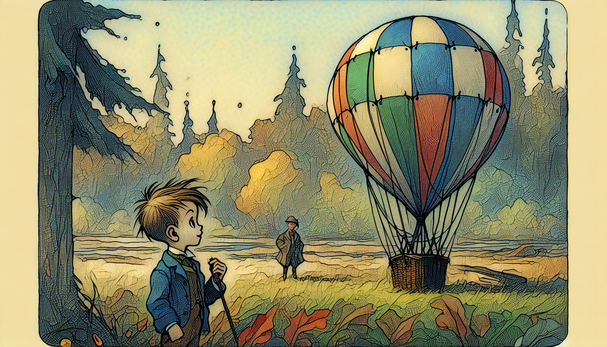 Ветерок с радостью потянул за верёвку, и воздушный шар начал медленно подниматься в небо. Вот они уже оставили позади поляну, затем лес, и вскоре леса, поля и реки остались далеко внизу, словно маленькие игрушки.