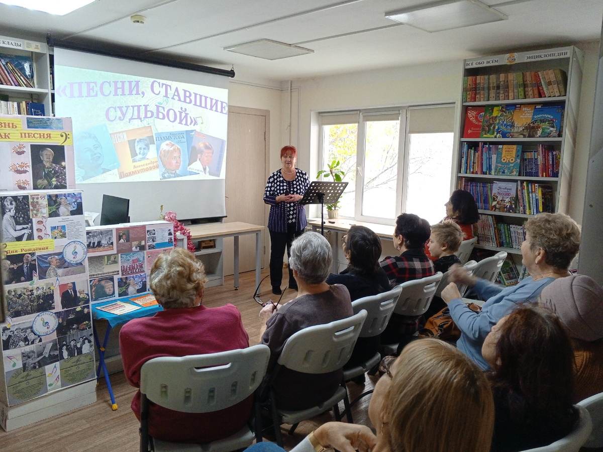 9 ноября 2024 года исполняется 95 лет известному советскому и российскому композитору Александре Николаевне Пахмутовой. Эта маленькая женщина — одна из самых замечательных личностей советской эстрады. Ею написано более 400 песен, которые стали вехами целой эпохи. Это и цикл «Созвездие Гагарина», «Обнимая небо», «Как молоды мы были», «Герои спорта». Невозможно перечислить все ее произведения! 6 ноября в Библиотеке семейного чтения состоялась музыкальная встреча под названием «Песни, ставшие судьбой», которая была приурочена к юбилею выдающегося композитора. Ведущая Анжелика Комарова рассказала о жизни и творчестве Александры Николаевны Пахмутовой, а также о создании ее самых известных и любимых песен. Гости смогли погрузиться в атмосферу творчества и насладиться мелодиями, которые стали настоящими шедеврами. Прозвучали песни «Надежда», «Я не могу иначе», «Герои спорта», «По Ангаре», были показаны видеофрагменты из фильмов «Девчата», интервью с Александрой Николаевной о создании эпическ