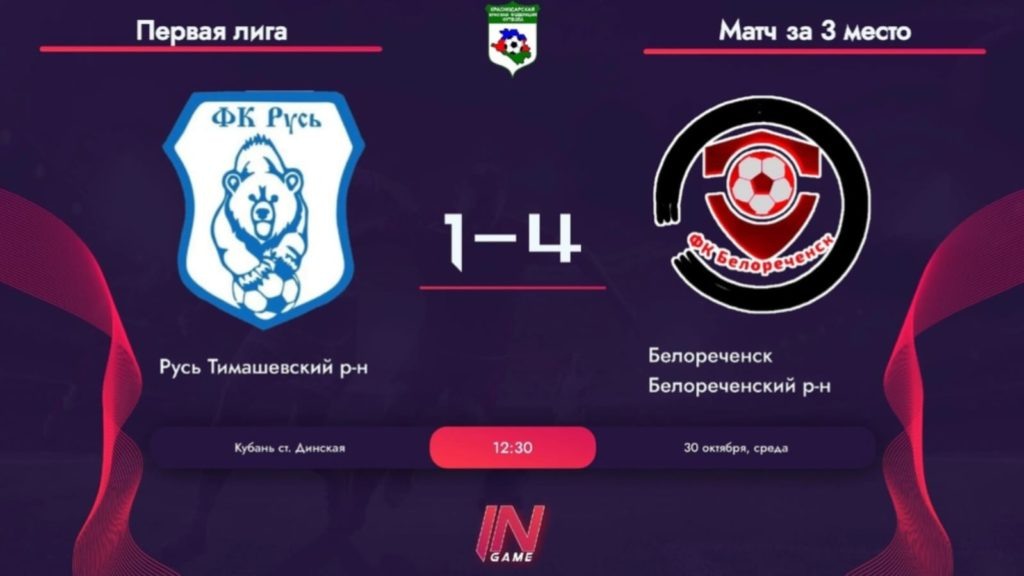 В матче за третье место днепровская «Русь» на поле станицы Динской встречалась с командой «Белореченск». Первыми счет открыли белореченцы. Счет 1:0 продержался весь первый тайм, и только в начале второго удар Дениса Купина по воротам соперника позволил нашей команде сравнять счет. К сожалению, продержался этот паритет недолго, до конца второго тайма футболисты «Белореченска» смогли забить в ворота нашей команды еще три мяча, оставшимися безответными. В итоге за «Белореченском» победа со счетом 4:1, он стал бронзовым призером первенства края, а наша «Русь» — на четвертом месте. Спасибо, ребята, за игру! Не будем отчаиваться, верим, у нашей «Руси» все впереди!