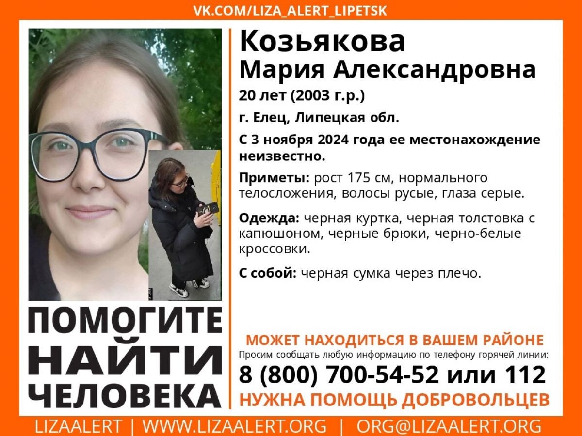 Любую информацию о местонахождении Козьяковой просят озвучить по телефону 8 (800) 700-54-52 или 112.