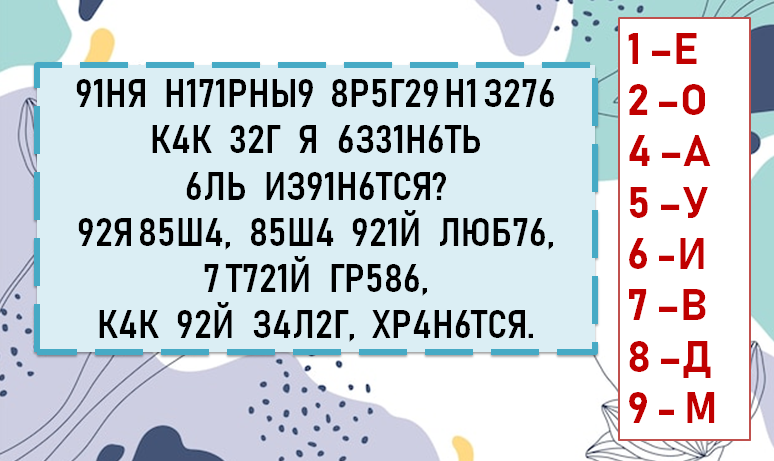 Мы уже делали аналогичное задание в упражнениях для поддержания когнитивных функций, которое многим понравилось. Поэтому решили вынести его в небольшой отдельный блок. Задача очень простая. Необходимо прочитать отрывок стихотворения, заменив цифры на буквы. Подсказка будет справа от текста. Какой из отрывков вам показался самым сложным, а какой понравился больше всего ? :)