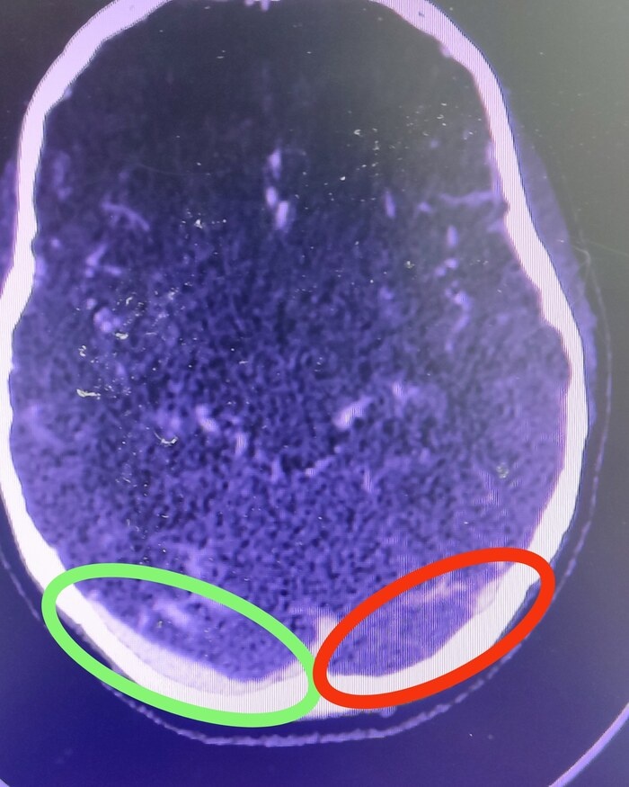 И прежде, чем проводить люмбальную пункцию с целью исследования спинномозговой жидкости, было решено провести компьютерно томографическую ангиографию сосудов головного мозга, где выявлен тромбоз поперечного синуса слева (на снимке он справа обведен красным цветом, потому что снимок отзеркален.)