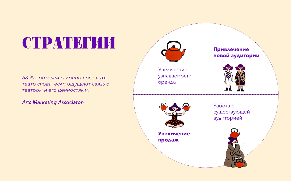 Чтобы создать настоящую связь со зрителем, важно понимать, кто он. Знаете ли вы возраст, пол, интересы и потребности вашей аудитории? Современная сегментация — это не просто "женщина, 35+, из города N". McKinsey утверждает, что 90% успешных маркетинговых стратегий опираются на глубокое знание аудитории. Сегодня зрители ждут от театра не только спектакль, но и ценности, эмоции и смыслы, с которыми они могут себя ассоциировать.