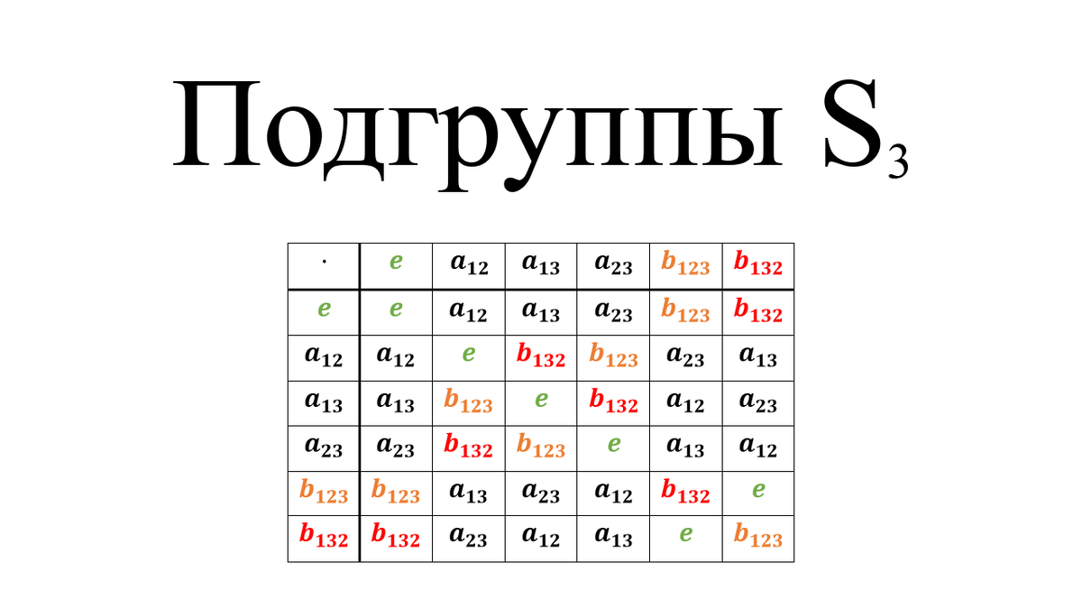В этой статье мы найдем все подгруппы группы S3. Напомню, что S3 — это группа из 6-ти разных перестановок: (1, 2, 3); (1, 3, 2); (2, 1, 3); (2, 3, 1); (3, 1, 2), (3, 2, 1). То есть, каждый элемент S3 можно воспринимать как биекцию, отображающую множество {1, 2, 3} на себя. Например, перестановка (2, 1, 3) меняет местами 1 и 2, но оставляет 3 на месте. Понятно, что можно применить одну перестановку после другой, в результате получив новую перестановку. Введем некоторые обозначения для элементов S3, которые помогут нам в дальнейшем: Кстати, все элементы a называются транспозициями, b — циклами длины 3. Будем обозначать множество всех транспозиций группы S3 как A, а множество циклов длины 3 как B. Ясно, что S3 = {e} ∪ A ∪ B. Поговорим теперь подробнее о композиции двух перестановок. Композицией перестановок p и q будем называть перестановку p⋅q, результат действия которой аналогичен результату следующих действий: применить сначала перестановку p, а затем q. Например, если применить любую