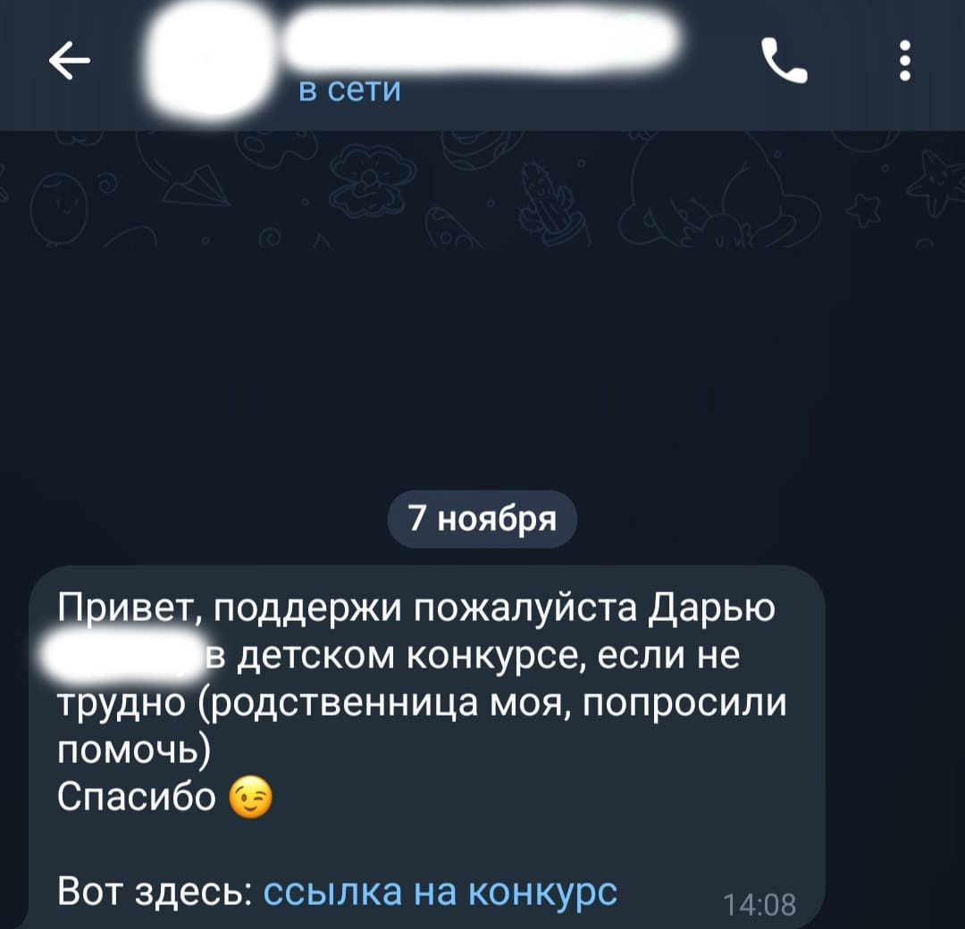 В последнее время от контактов всё чаще стали приходить сообщения с просьбами проголосовать в том или ином конкурсе за них, детей или же родственников. Например, вот такие: Будьте осторожны - теперь это популярный способ угнать ваш телеграмм/вацап или, что ещё хуже, аккаунт госуслуг. При голосовании вас попросят войти в свой телеграмм или же ввести код подтверждения входа, который на самом деле будет подтверждением входа мошенников в вашу telegram/whatsapp/госуслуги и т.п. Вот так выглядит мошеннический сайт: Вот ещё один пример мошенничества с голосованиями, тут они подошли скрупулёзно, даже учли специфику работы: В обоих случаях проголосовавший участник своим "голосом" позволял мошенникам войти в свой аккаунт Telegram. Так что будьте аккуратнее, не стоит переходить по непонятным ссылкам!