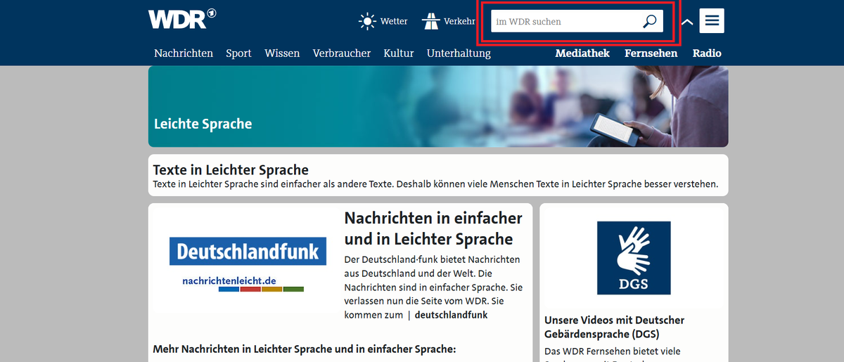 WDR — это аббревиатура для Westdeutscher Rundfunk, то есть западнонемецкого радио и телевидения. WDR является государственной некоммерческой радиовещательной корпорацией земли Северный Рейн-Вестфалия. У WDR есть сайт. А чем он нам может быть полезен? На интернет-странице WDR можно найти видео, тексты, изображения и аудиофайлы. Много контента при этом на облегчённом немецком (Leichte Sprache). WDR сообщает о событиях из Северного Рейна-Вестфалии и всего мира, поэтому большая часть контента - новости в том или ином виде. Однако, можно найти и информацию на другие темы: спорт, наука, культура, развлечения. На сайте вы можете воспользоваться функцией поиска или навигацией. Поле поиска расположено в верхней части страницы на тёмно-синем фоне. Вводим нужное слово / слова и жмём на значок лупы. Навигация сортирует страницы сайта по разделам и тоже находится в верхней части страницы. Выбираем новости / спорт / культуру и просматриваем материалы в разделе. В верхней части страницы WDR также