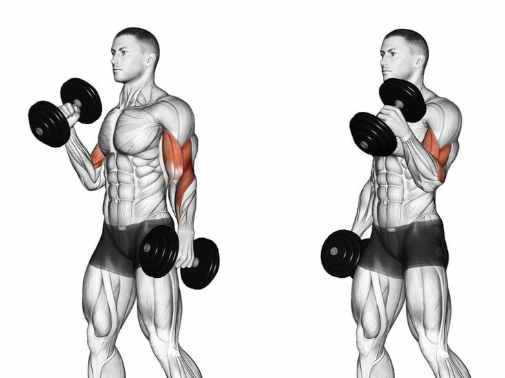Всем доброго времени суток, сегодня разберём базовые упражнения на бицепс. 1 упражнение выглядит таким образом, листай вниз:) Упражнение называется «молотки», берём гантели в обе руки и начинаем поднимать поочерёдно, как показано на картинке, все упражнения выполняются также в отказ, можно также с читингом, чтобы довести до полного отказа. 2 упражнение (можно с гантелями если нет штанги) Если выполняете дома, то можно использовать стул или кровать, садимся и начинаем выполнять упражнение, слева исходное положение, справа конец, главное, когда сил уже не будет, то не переусердствовать и не упасть назад, для этого нужно корпус держать напряжённым, сильно наверх штангу не поднимать, ноги должны быть вашей опорой, а не в расслабленном положении. 3 упражнение лично мне оно нравится тем что я прям чувствую жжение в мышцах доводя их до отказа Нам также понадобятся гантели и стул либо край кровати, ноги вместе, исходное положение — гантели внизу, начинаем поочерёдно поднимать гантели, прям к
