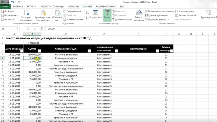 'Отдел маркетинга'!C$2 — номер искомого месяца транзакции в форме бюджета отдела маркетинга (обратите внимание, что мы фиксируем название строки, чтобы можно было копировать эту формулу в ячейки ниже).