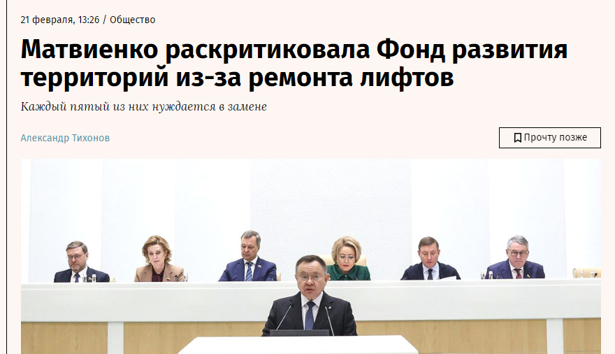 Например, в феврале этого года темой лифтов озаботилась глава Совета Федерации легендарная Валентина Матвиенко.
