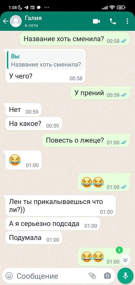 Шла третья ночь без сна, в интенсивной работе перед сложным процессом, поэтому шутки уже воспринимались тяжело😄. Мы предполагали, что предстоит последнее судебное заседание, в связи с чем готовили прения. Прения - это выступления истца и ответчика, в которых они последний раз перед вынесением судом решения анализируют дело и озвучивают основные выводы по нему❗ Процесс, по которому мы готовились, шел уже второй год, был очень насыщенным и напряженным, в частности из-за личности и поведения ответчика😤. Однако во время самого судебного разбирательства редко удается дать какую-то оценку противоположной стороне, а вот прения как раз для этого и придуманы😉 Поэтому Галия Саидовна решила подготовить не только устное выступление, но и приобщить к делу письменные прения📜, где ей наконец-то предоставилась возможность самыми яркими красками обрисовать поведение ответчика. В этот раз она даже использовала иносказательную форму😯 Часть нашей ночной переписки вы видите на фотографии. Автор публик