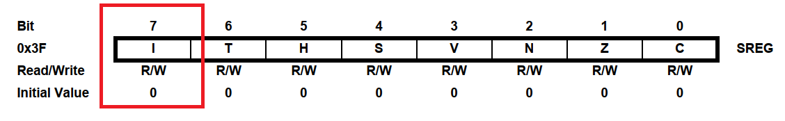 В процессорах (и в микроконтроллерах, конечно) обычно имеется флаг глобального разрешения прерываний (ну или запрета - кому как нравится). С помощью этого флага можно разрешить или запретить ВСЕ прерывания. Запрет прерываний обычно используется для того, чтобы защитить от неожиданностей какие-то критические участки кода. Например, перед обработкой какого-то зависимого от времени процесса желательно запретить прерывания, иначе в случае возникновения прерывания на его обработку потребуется время, и этого времени может не хватить потом на завершение процесса (либо будут потеряны данные, которые поступили во время обработки прерывания). В микроконтроллерах AVR флаг глобального прерывания находится в 7-м разряде регистра статуса SREG: Это флаг называется I (первая буква слова Interrupt - прерывание). На состояние этого флага не влияют ни арифметические, ни логические операции. Для управления им имеются две особые команды (о них чуть позже). Если флаг I сброшен, то все прерывания в микроконт