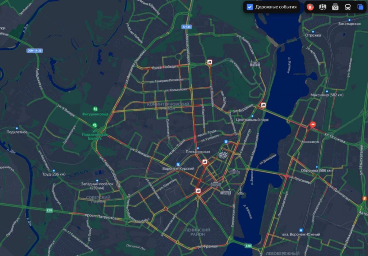 Пробки снова сковали дорожное движение в городе вечером 7 ноября. Согласно данным "Яндекс Карт", загруженность движения в Воронеже оценивается в 8 баллов. Труднее всего проехать в Центральном районе города. "Стоят" улицы Кольцовская, 9 Января, Фридриха Энгельса, Чернышевского и Плехановская, а также проспект Революции. Причиной одной из пробок является автомобильная авария на пересечении Плехановской и Кольцовской улиц. Также ДТП зафиксировано на пересечении улиц Кирова и 20-летия Октября. Из-за дорожных работ на Остужевском кольце снова осложнено движение на Ленинском проспекте, по направлению к кольцу, а также на улицах Остужева и Переверткина. Также воронежские автомобилисты в этот вечер "застряли" на Чернавском мосту. По данным "Яндекса", там тоже произошла автомобильная авария. В Коминтерновском районе заторы сковали автомобильное движение на улицах Хользунова, Машиностроителей, Электросигнальной, Маршала Жукова, 60-й Армии и генерала Лизюкова, а также на Московском проспекте, про