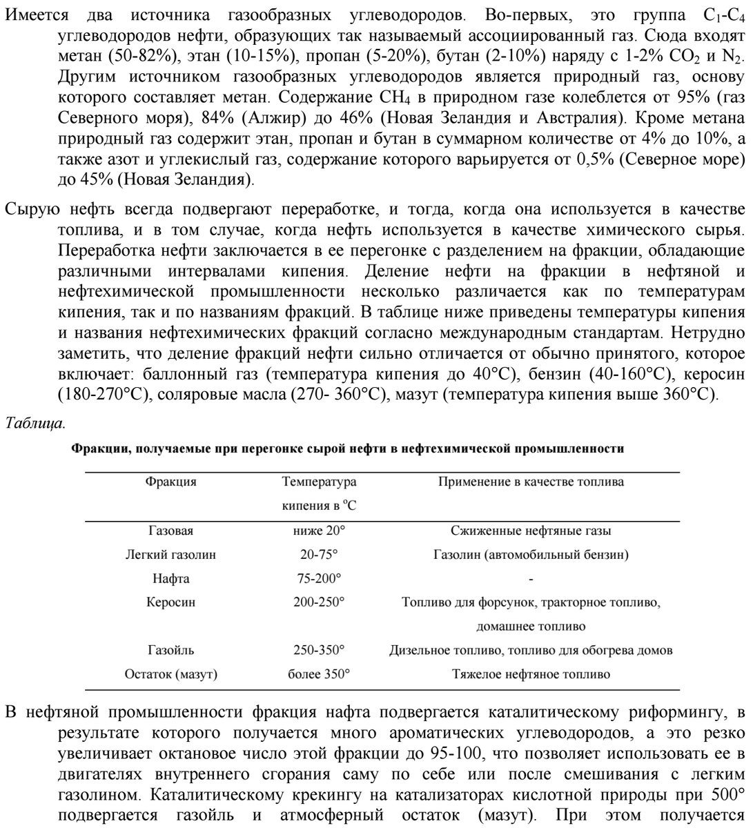 Сырая природная нефть представляет собой вязкую жидкость, окраска которой изменяется от темно-коричневого или черного до зеленого цвета. В состав нефти входят углеводороды трех классов: алканы, циклоалканы (нафтены) и ароматические углеводороды. Соотношение их резко меняется в зависимости от расположения нефтяного месторождения. Всего из нефти выделено и идентифицировано более трехсот индивидуальных углеводородов, и общее их количество оценивается в несколько тысяч. Этилен прочно занимает первое место по общему объему производства среди всех других продуктов нефтехимического синтеза. Мировое производство этилена в 1990 году превышало 50 млн. тонн в год, из них в США - 17,5 млн. тонн, а в Великобритании 1,5 млн. тонн. Этилен получают в результате термического крекинга этана, пропана, а также фракций нафты и газойля. В странах, богатых природным газом или импортирующим его в большом количестве, для крекинга предпочитают использовать в качестве сырья этан, пропан и в меньшей степени нафту