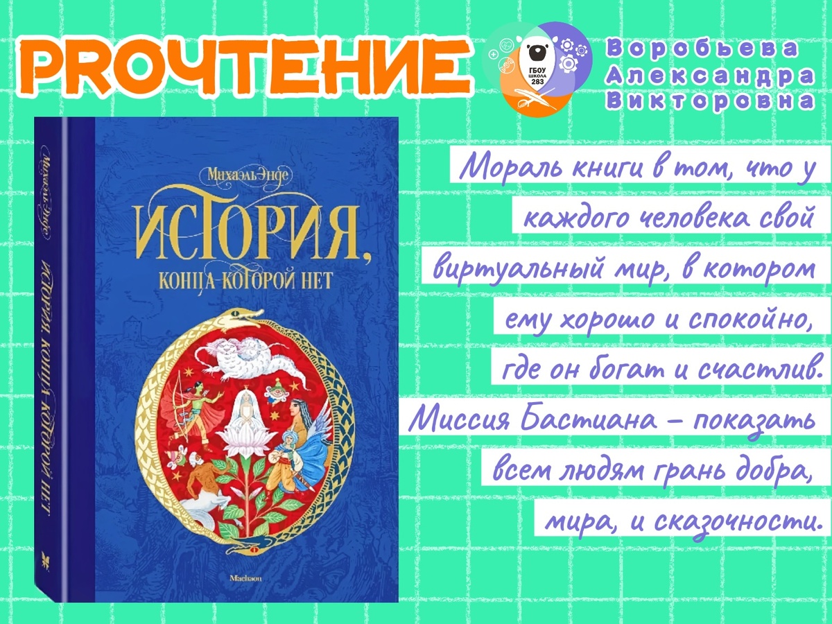 📝 Традиционная авторская колонка от методиста нашей школы, журналиста с многолетним стажем, Александры Викторовны Воробьевой https://vk.com/sanechka78. 🪄 Знаете, есть книги, которые захватывают своей сказочностью и необычностью, своей детской абсурдностью и взрослой глубиной. 🐇 Вот так однажды я познакомилась с Алисой, которая упала в нору, побежав за Белым Кроликом. И до сих пор чувствую на себе магию того теплого летнего дня, когда вместе с героиней пустилась в путешествие… 🎁 И вот подарок небес, еще одна такая книга, еще одна невероятная история. 📕 Помните, в советском фильме «Новогодние приключения Маши и Вити» была такая фраза: «А если я вас в сказку впущу?». Так вот, именно это и произошло с Бастианом Бальтазаром Бруксом в книге Михаэля Энде «История, которой конца нет». 👦🏻 Итак, нелюдимый одиннадцатилетний Бастиан, которого одноклассники считают слабаком обожает разные истории: он их читает и придумывает. ☂️ Одним ноябрьским дождливым днем он забегает в лавк