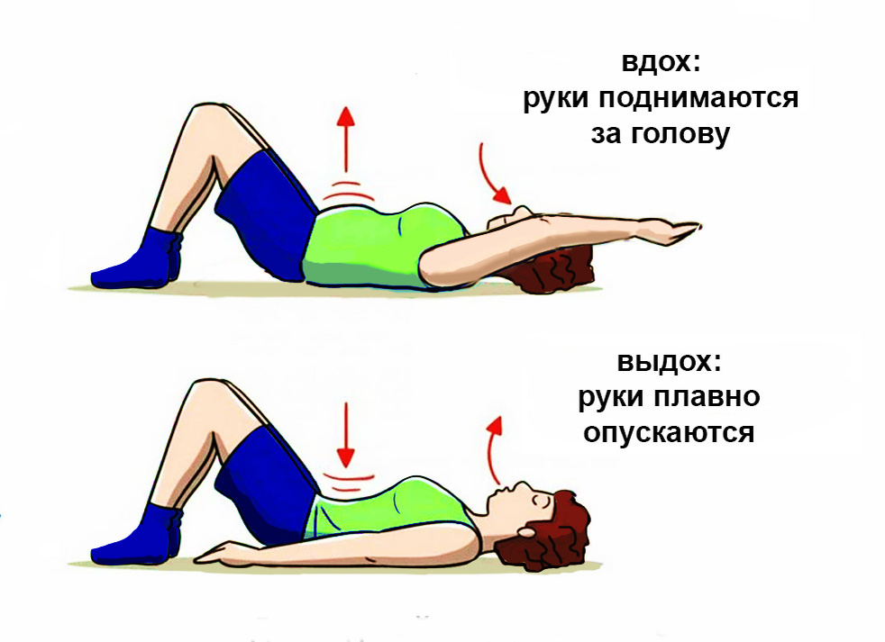 Дыхание выполняется, в основном, животом. Это один из видов диафрагмального дыхания. На сколько я знаю, это дыхательная техника для успокоения, пришедшая из Японии. Для выполнения этого упражнения необходимо занять положение лежа на спине (при таком положении тела лучше расслабляется мускулатура брюшной стенки). Далее согнуть ноги в коленях, успокоиться. Руки вытянуты вдоль тела. На вдохе поднять расслабленные руки вверх (со скоростью вдоха), затем при выдохе опустить их, одновременно (со скоростью выдоха). Подробная инструкция: Вдох: Движение при вдохе начинается с живота, он поднимается. На вдохе необходимо максимально поднять живот и наполнить легкие воздухом. Одновременно со вдохом руки идут вверх. Пока надувается только живот, руки ещё внизу. Когда воздух надувает грудь, руки уже подняты перпендикулярно к туловищу. А когда все лёгкие уже заполнены воздухом, руки находятся за головой. Выдох: На выдохе первым сдувается живот, потом грудь. Сначала выдохните воздух как бы из живота —