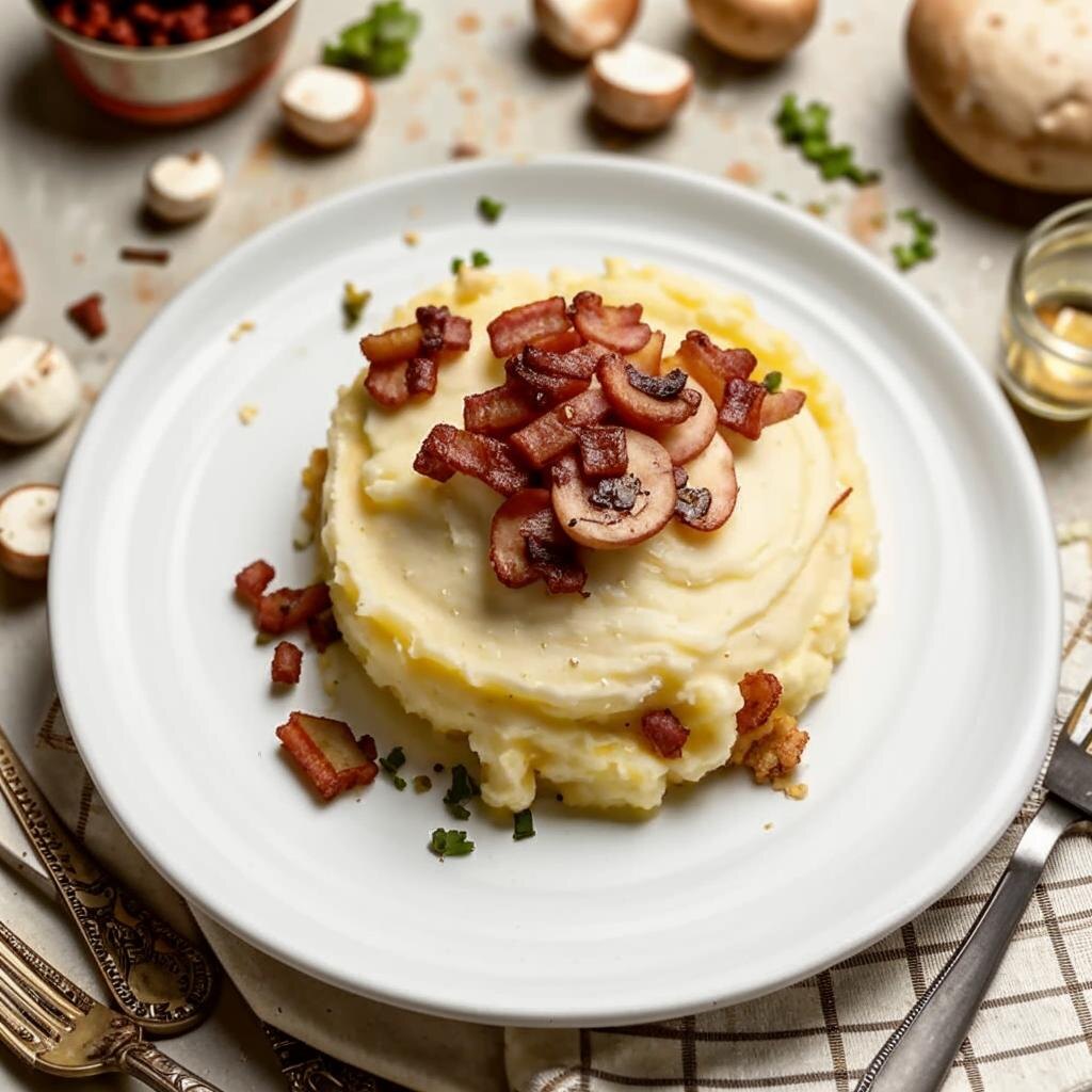 Ингредиенты: 1. Чистим картофель, нарезаем на крупные части и отвариваем в подсоленной воде. Проверяем готовность — когда картошка станет мягкой. Сливаем жидкость, но не полностью. Вода нам еще пригодится. 2. Пока картофель варится, на сковороде разогреваем немного масла и обжариваем мелко нарезанный лук. «Карамелизованный" лук даст нашему блюду сладковатый аромат и вкус. Лук откладываем в отдельную емкость. 3. Обжариваем мелко нарезанные грибы и бекон. Тут важно, чтобы бекон и грибы хорошенько подрумянились, так они отдадут свой вкус маслу и сделают блюдо насыщенным и ароматным. Добавляем в смесь приготовленный лук. 4. Приступим к пюре. Разминаем картофель до однородности, добавляя понемногу оставшуюся жидкость, чтобы добиться правильной консистенции. Подаем горячим, положив сверху начинку из грибов, бекона и лука и посыпав зеленью по желанию. Совет: