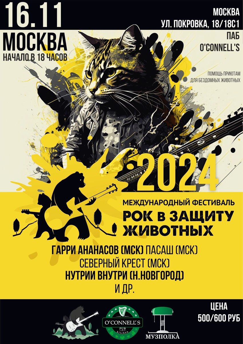 Огромная поддержка для бездомных животных такие мероприятия💓 Повышение осведомленности у людей о том, что животные без дома есть, их много и что им можно помочь - это одно из самых важных целей в зоо-благотворительности, ведь не все знаю о существовании в принципе приютов... А помощь, собранная в рамках мероприятия, идет на закупку самого необходимого для подопечных приюта🙏 Уже скоро мы будем ждать встречи на фестивале "Рок в защиту животных", где соберутся люди, любящие животных, разделяющие наши взгляды и кто хочет как-то принять участие в жизни нашего приюта💓 Приходите! Мы будем очень ждать всех🔥 Билеты можно купить уже сейчас: По всем вопросам пишите пожалуйста мне на вотсап 89055321236 💓 ГДЕ, КУДА, КОГДА: 📅 16 ноября O'Connell's | ул.Покровка 📍Москва, ул. Покровка, 18/18с1 ⏰18:00 Музыканты🪇:✨СЕВЕРНЫЙ КРЕСТ (Мск)✨НУТРИИ ВНУТРИ (Нижний Новгород)✨Гарри Ананасов (Мск)✨Пасаш (Мск)✨D'Версия ex-D'Каданс (Мск)✨ ДО ВСТРЕЧИ💓Все новости о встрече в группе https://vk.com/rock_zveri