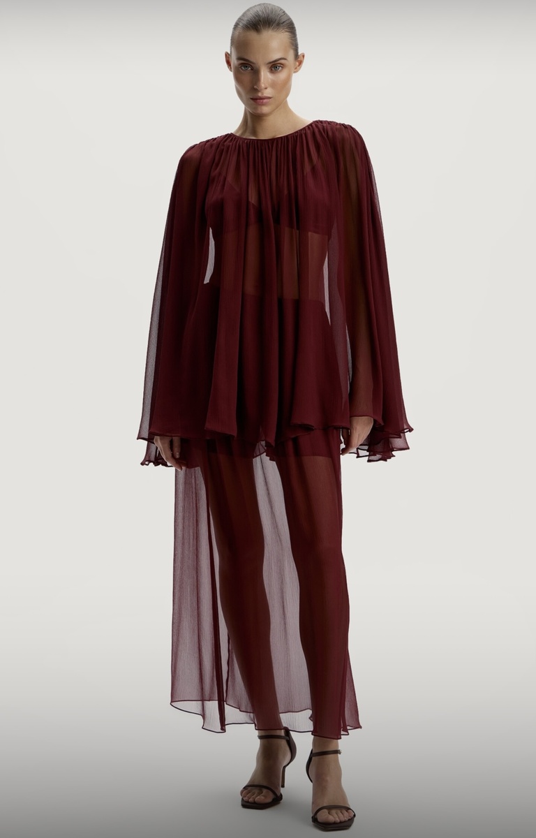 лиф с эластичной тесьмой под грудью выполнен из плотного шелка, а свободная накидка с застежкой на пуговку - из прозрачного и летящего шелкового шифона.