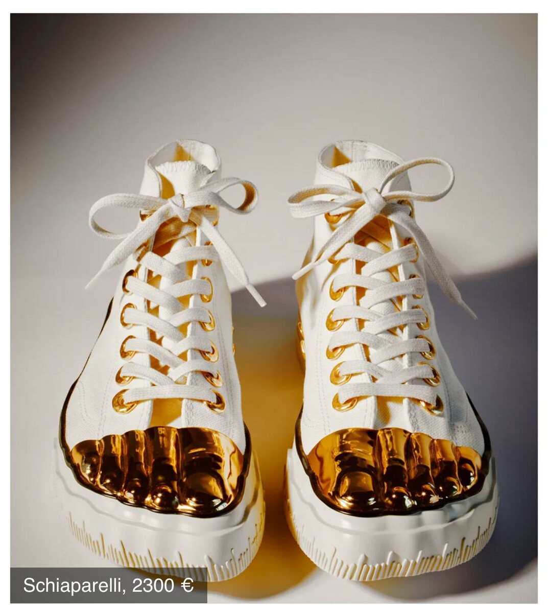 Кутюр на Максималках. Вы мечтали, мы воплощаем 🪄 Девочки и мальчики трепещите: будем цокать у парадной копытцами золотыми. Самый сюрреалистичный бренд мировой моды Модный дом Schiaparelli выпустил кеды с носками в виде золотых пальцев. Будем знакомиться с чудесным, эксцентричным миром итальянского модельера Эльзы Скиапарелли. Скажи мне кто твой друг, и я скажу - кто ты. Скиапарелли дружила и сотрудничала с Сальвадором Дали и Жаном Кокто и соперничала с Коко Шанель. Вы только взгляните на эти сногсшибательные «тяги», да простит меня Достоевский. Но до чего же они хороши! Конечно же: для самых смелых и дерзких. Кутюр на максималках 🤤🤩 Вы только подумайте: в этих кедах все двери открыты! Причем в прямом смысле этого слова 🦶 А еще предлагаю в них щеголять по дорожкам резиновым в спорт зале. Хочешь внимание притянуть, а орех еще не достаточно прокачен? Бери другим! Золотые пальчики! И гантельку не страшно уронить, ну и все взгляды будут понятно на кого обращены… может и