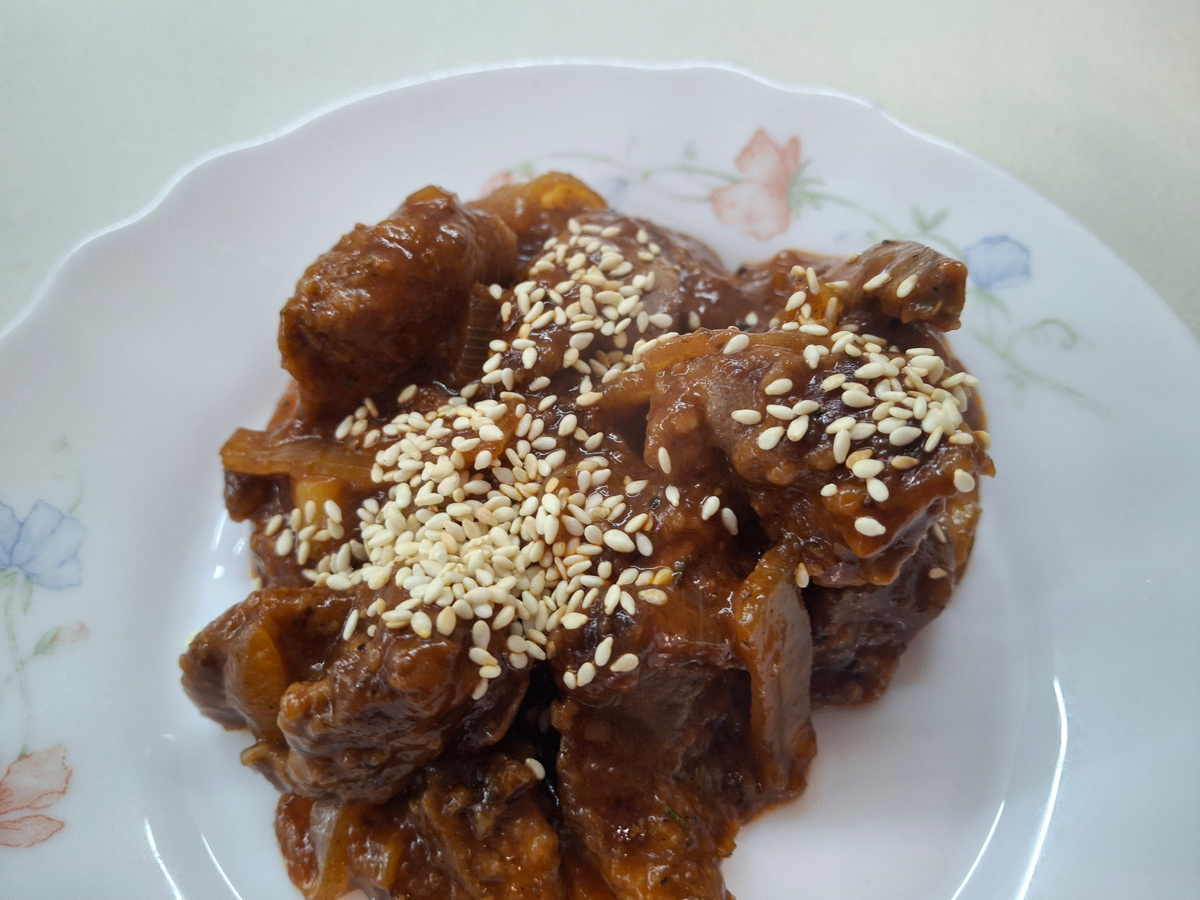 Состав: Приготовление: Куриную печень вымыть, порезать пополам, убрать жилки (если есть). Замочить в молоке на 3-6 часов (поставить в холодильник). Я залила утром, а вечером готовила. Откиньте на дуршлаг, дайте стечь молоку. Лук режем полукольцами, тонко. Имбирь трём. Готовим соус: смешиваем воду, соевый соус, мёд и томатную пасту. Переложите печень в пакет и насыпьте туда муку. Завяжите и потрусите. Печень равномерно обваляется в муке. На разогретую сковороду добавляем масло и выкладываем печень. Обжарить с двух сторон на сильном огне, по 2-3 минуты. ОСТОРОЖНО! Она «стреляется» Добавляем лук и жарим, помешивая 2-3 минуты. В сковороду с печенью добавляем имбирь, тимьян и перец. Перемешиваем и добавляем соус. Убавляем огонь, всё смешиваем, накрываем крышкой. Тушим на медленном огне 10 минут. Готово. Можно подавать как отдельное блюдо. Для красоты, посыпьте кунжутом. Я подавала со спагетти. Приятного аппетита!!!