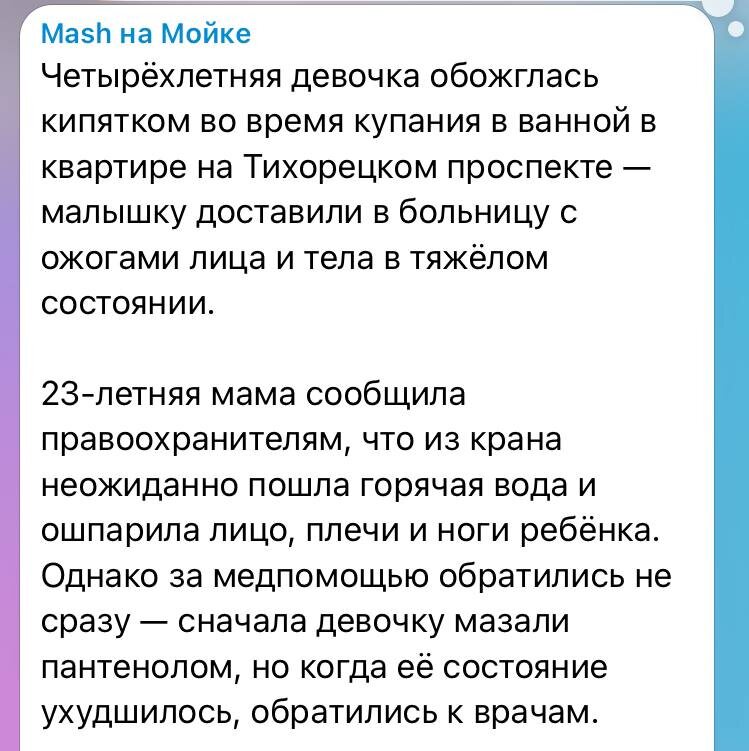 Недавно журналисты сообщили о несчастном случае, произошедшем с ребёнком в Санкт-Петербурге. В двух словах, мама купала ребёнка в ванной, из крана пошла горячая вода и нанесла ожоги 2-3 степени лица, плеч и ног (площадь 20%). Сначала пытались лечить ребёнка самостоятельно, затем, когда состояние ухудшилось, вызвали скорую. Ребёнок госпитализирован в ожоговое отделение Первой детской больницы.