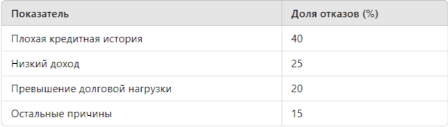 Получить отказ в кредите может быть неприятно, особенно если деньги нужны срочно. Чтобы избежать подобных ситуаций, важно знать основные причины отказа и как их избежать. Эта статья подробно расскажет о возможных причинах отказа, а также предложит решения для улучшения ситуации. Кредитная история — это ваш финансовый паспорт. Если в прошлом вы допускали просрочки, брали слишком много кредитов или не возвращали займы вовремя, это может повлиять на решение банка. Согласно исследованию Бюро кредитных историй, более 40% отказов связано с плохой кредитной историей. Иногда банки отказывают из-за ошибок, допущенных в вашей кредитной истории. Например: Совет: Регулярно проверяйте свою кредитную историю через БКИ. Если сумма ваших ежемесячных выплат по кредитам превышает 50% дохода, банки могут посчитать вас ненадежным заемщиком. Как рассчитывается долговая нагрузка? Формула: