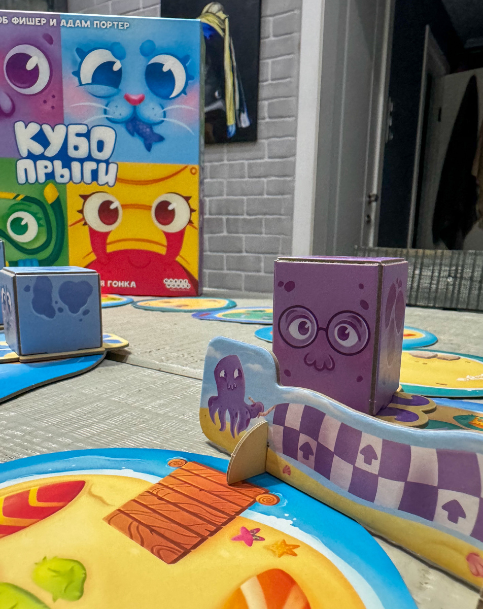 «Кубопрыги» поиграны — пора делиться впечатлениями! ПРАВИЛА «Кубопрыги» — по факту игра-ходилка, где вашим кубопрыгам вроде бы и хорошо добраться первыми до финиша, обойдя целиком игровое поле, а вроде бы и главное — набрать при этом больше всего жемчужин. В игре есть две режима, и мы сыграли два раза в простой, а после него играли всё время в продвинутый, потому что там откровенно больше тактики. В простом режиме вы бросаете кубики и двигаете тех кубопрыгов, которые выпали по результатам броска. Например, большого кубопрыга на 2, среднего на 1, а маленького на 2. Но в игре всё происходит как в «Черепашьих бегах»: если кубопрыги оказываются на одной клетке, они выстраиваются в башенку — и один кубопрыг может везти хоть всю ораву на своей спине. Если в простом режиме вы останавливаетесь на клетках с ракушками, вы тянете случайным образом одну из ракушек, на обратной стороне которой 1 или 2 жемчужинки — чистые ПО в игре. Если вы останавливаетесь на острове с короной, то получаете корону,
