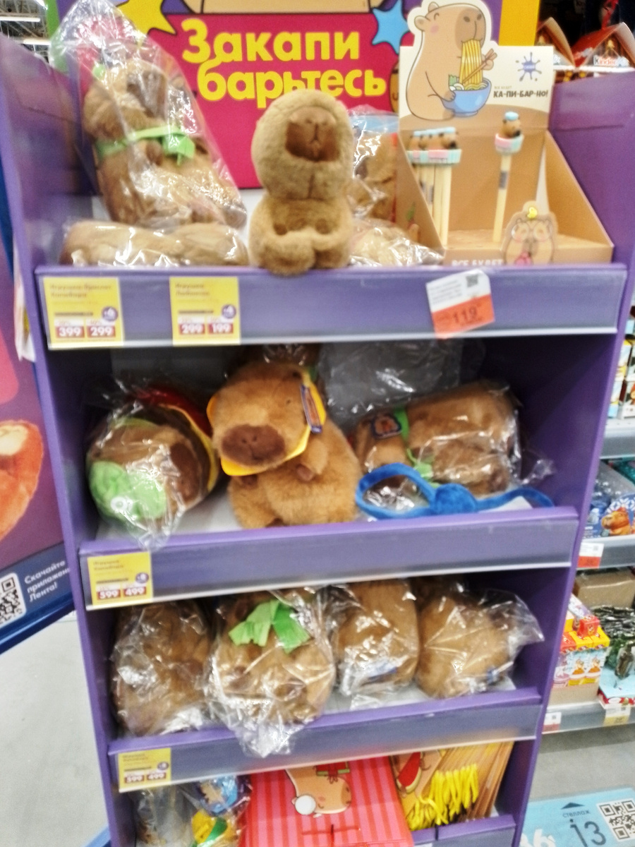 20 ноября мы с мужем приехали в гипермаркет "Лента", чтобы купить свинину для тушенки. Готовим мы ее в автоклаве, получается очень вкусно и дешево. Разумеется, мы не обошлись покупкой только мяса. Вот никогда еще не было такого, чтобы в этом большом магазине было куплено всё только по списку. Всегда находится что-то "очень нужное" помимо списка. На входе в торговый зал нас встретил стеллаж с капибарами. Я не смогла пройти мимо и примерила капибару-браслет. Просто милейшее создание. Очень хотелось забрать ее с собой, но силой воли я себя остановила. Ну взрослая же девушка, куда оно мне. А вот и ценник на эту милашку. Пройдя еще несколько шагов, попадаешь в новогоднюю сказку. Я очень старалась пройти эти ряды побыстрее и не разглядывать каждую красивую безделушку. Я смогла не свернуть внутрь этого отдела, а всего лишь полюбовалась на то, что было выставлено вдоль широкого прохода. Особенно обратила внимание на симпатичного Деда Мороза. Надоело уже, что везде продают одних Санта Клаусов.