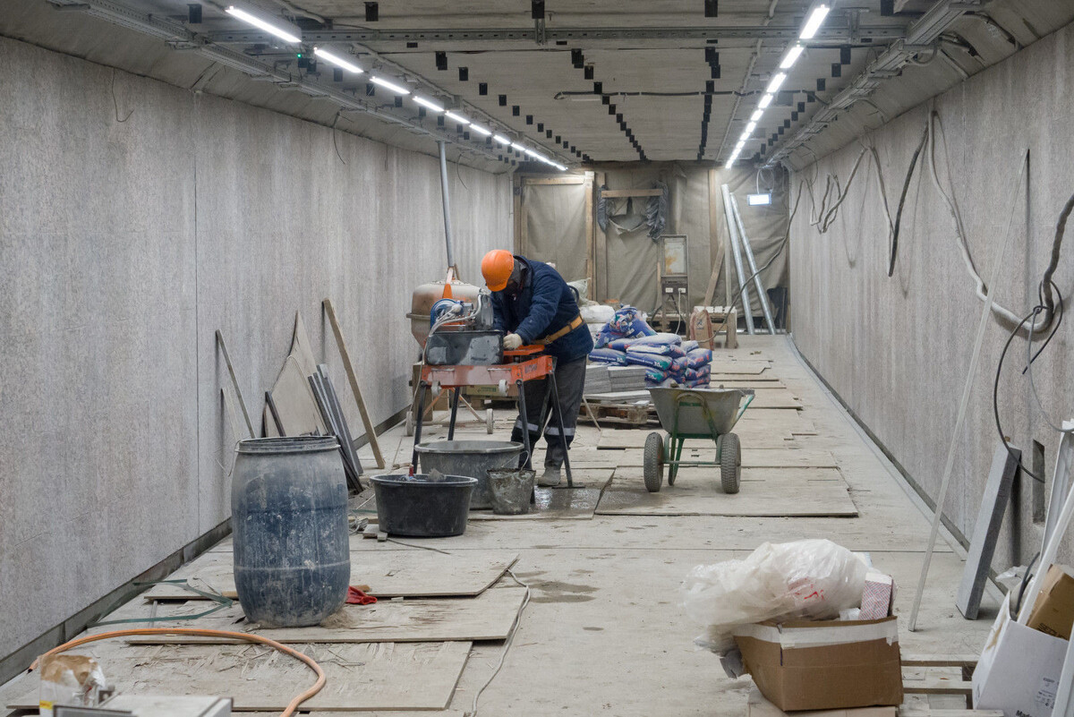 «Продолжаются работы по отделке тоннеля гранитными плитами и прокладке сетей», — рассказали в комитете по развитию транспортной инфраструктуры Петербурга.
