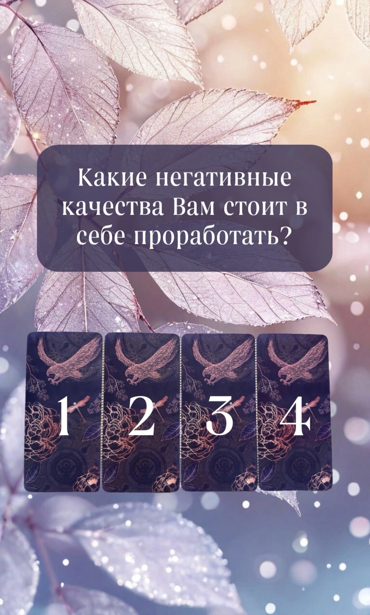 Здравствуйте,мои дорогие 👩❤️👩 «Какие негативные качества вам стоит в себе проработать?» Давайте сегодня узнаем 💁🏻♀️Выбирайте одну из 4-х карт и читайте дальше 🤗❤️