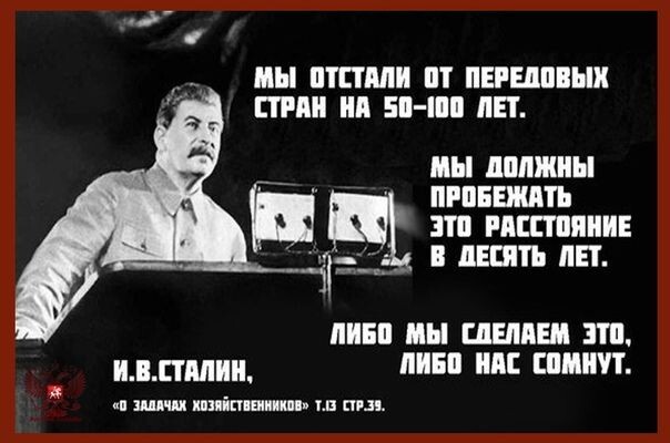Эти слова Иосиф Виссарионович Сталин произнес. 4 февраля 1931 года, Первой Всесоюзной конференции работников социалистической промышленности, 4 февраля 1931 г., в рамках текущего, крайне амбициозного, первого пятилетнего плана развития народного хозяйства СССР 1928-1932 гг., с целью превращения СССР из отсталой аграрной страны в современную индустриальную державу!