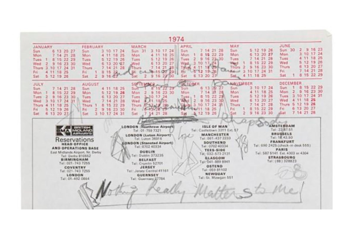 За черновик «Рапсодии» покупатель отдал 1,7 млн долларов. Текст композиции был написан на календаре (!) авиакомпании British Midland. В Сеть попало фото рукописи — и на нем видно, что изначально Меркьюри подумывал назвать «Рапсодию» не «Богемской», а «Монгольской». Но потом Фредди зачеркнул первый вариант и заменил его.