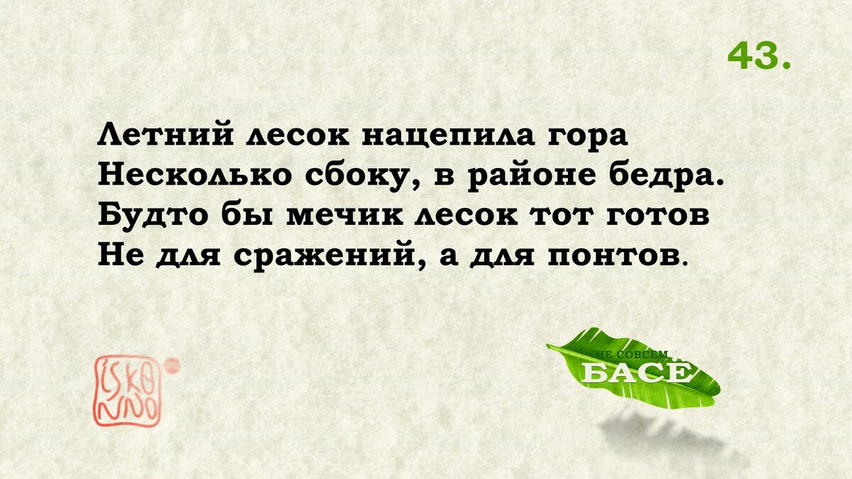 Не для сражений, а для понтов. Безусловно, мастерский текст, не находящий, однако, отзыва. Басё по своему обыкновению выстраивает два смысла. Попробуем прочесть? Сезонный хайку начинается с сезонного слова, вернее, с явно названного сезона: «лето» [нацу]. [Ко-дати], «маленький лес». Даны время и место. Первая строка разобрана, переходим ко второй. Неожиданно [хаку] — «прикреплять», «носить одежду», «носить на боку, на поясе» (обычно о клинковом оружии). И уже здесь чувствуется неловкость. Слово многозначное, но все значения связаны с человеком, что плохо соотносится с первым прочитанным нами смыслом. Тем не менее, понятно, что нам нужно вернуться и перечитать первую строку. [Ко-дати] может означать и «малый меч» (с длиной клинка до двух сяку, ок. 60 см). Кодати похож до смешения на малый меч вакидзаси, используемый самураями в паре с обычным мечом катана, н