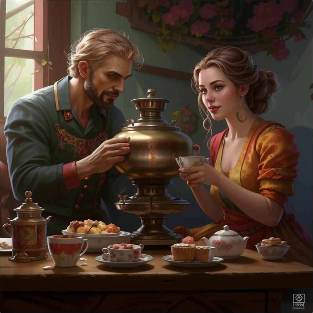 Чай был вкусный, ароматный, как я поняла, привезенный откуда-то издалека, и очень дорогой. Ну это можно было и не уточнять, и по аромату понятно, что не обычный, из коробки или пакета. К чаю были сладости, в смысле, кроме моего пирога. Какие-то конфетки интересные с орешками, пахвала и даже чак-чак. Вот интересно, откуда он все это берет? Вроде ж в лесу живет, а такие деликатесы.