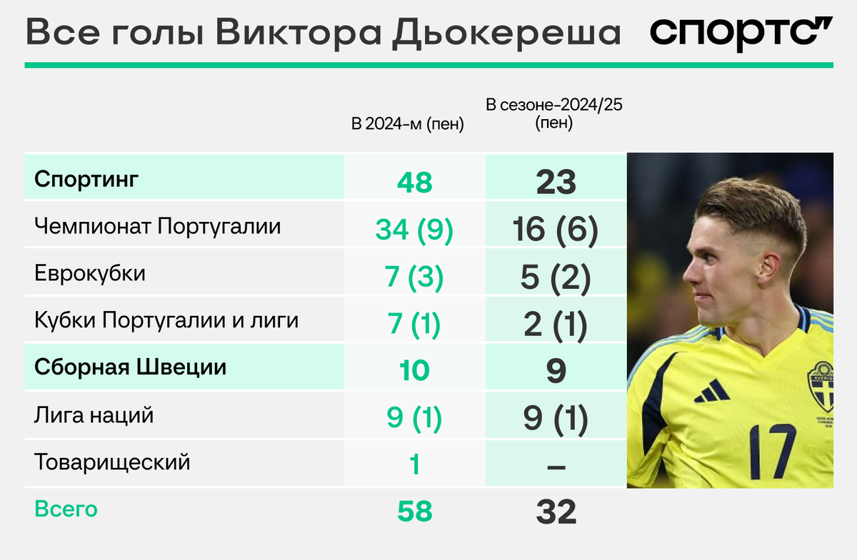 Тут сходим с ума вместе. Виктор Дьокереш теперь раскромсал сборную Азербайджана в Лиге наций: забил четыре и помог выиграть 6:0. ● 32 гола и восемь ассистов в 24 матчах сезона за клуб и сборную. 10 из них именно за Швецию всего в шести матчах: только в одном не забил, только его шведы и не выиграли (2:2) со Словакией. ● 1,3 гола за матч в сезоне. И темп не падает, таким перфомансами, как сейчас против Азербайджана, Виктор тянет показатель только вверх. ● Дьокереш сделал второй покер за три недели. 1 ноября он загрузил четыре «Эштреле» в чемпионате Португалии, через пару дней выдал три «Манчестер Сити» в Лиге чемпионов, и вот теперь снова. ● Виктор забил в 18 из 24 матчей сезона. Да, лишь шесть раз ушел без голов, и то в Кубке Португалии и Суперкубке, когда не забивал, помогал ассистами. Виктор Дьокереш в большом отрыве неофициальной гонки бомбардиров года. Любопытно, что в 2023-м Криштиану Роналду хватило 53 мячей, чтобы ее выиграть. У шведа из Спортинга еще восемь матчей до Нового год