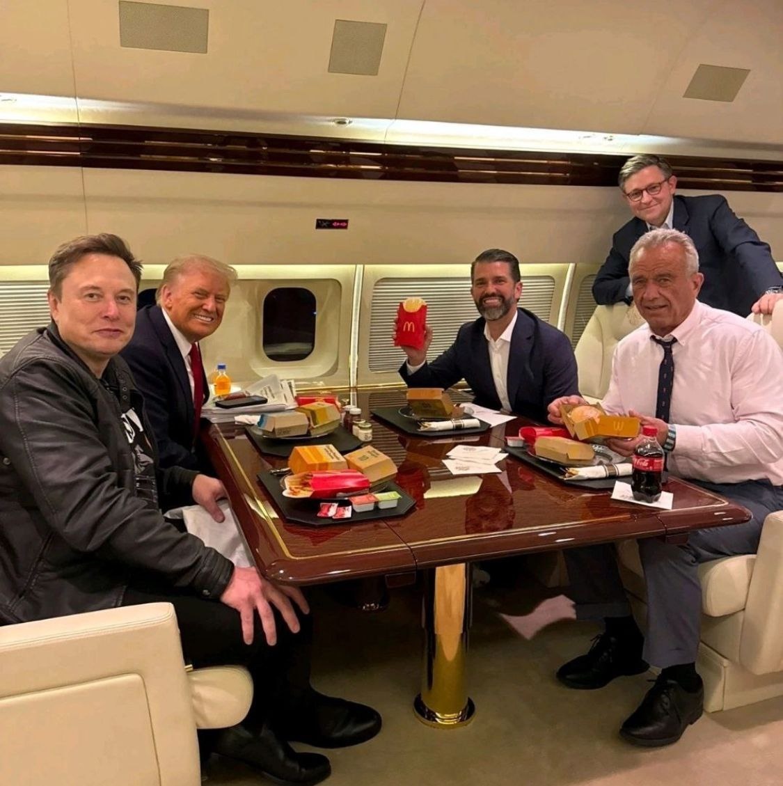 "Это первое изображение было сделано пару дней назад: Трамп, Илон и их приятели едят McDonalds в самолете.