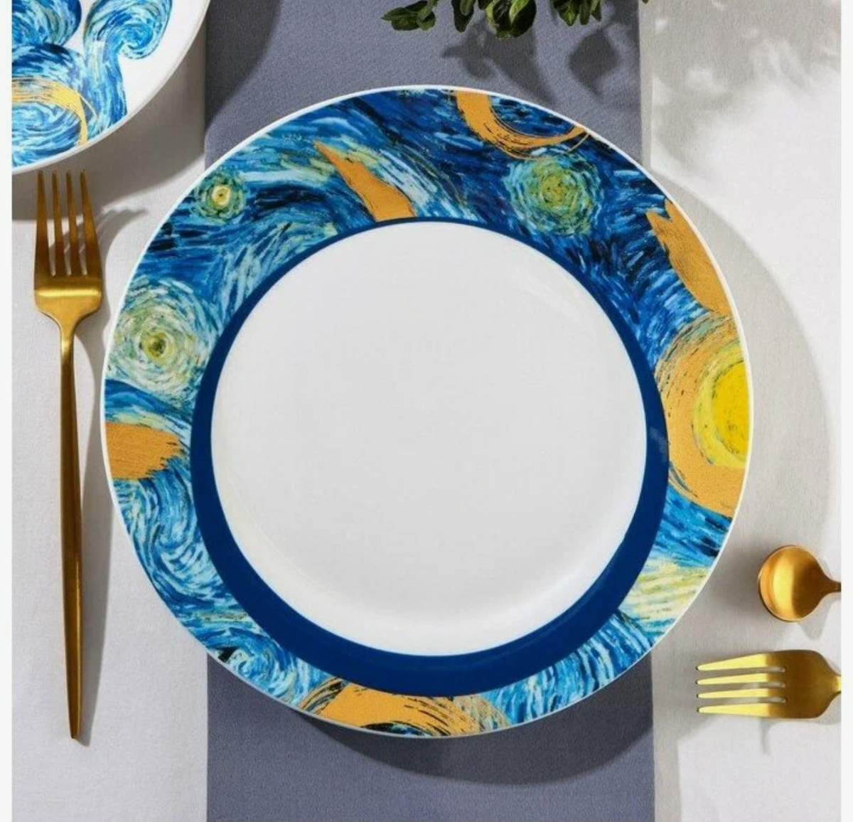 Мимо посуды с желто-синим принтом пройти очень сложно ))). Посуда яркая и необычная. Обеденная тарелка - 25,5 см и десертная тарелка - 20 см.