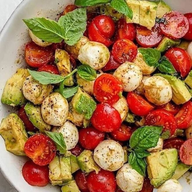 Шикарный салат КБЖУ 198.98/5.65/17.84/4 Ингредиенты: ▫️Минишарики из моцареллы ▫️Помидоры черри ▫️Авокадо ▫️Базилик ▫️Оливковое масло ▫️Бальзамический соус ▫️Соль, перец Приготовление: ▫️В салатник поместите мини-шарики из моцареллы, порежьте помидоры черри, нарежте кубиками авокадо и базилик. ▫️Приправим салат солью и свеже молотым черным перцем по вкусу, сбрызнуть оливковым маслом и бальзамическим соусом.