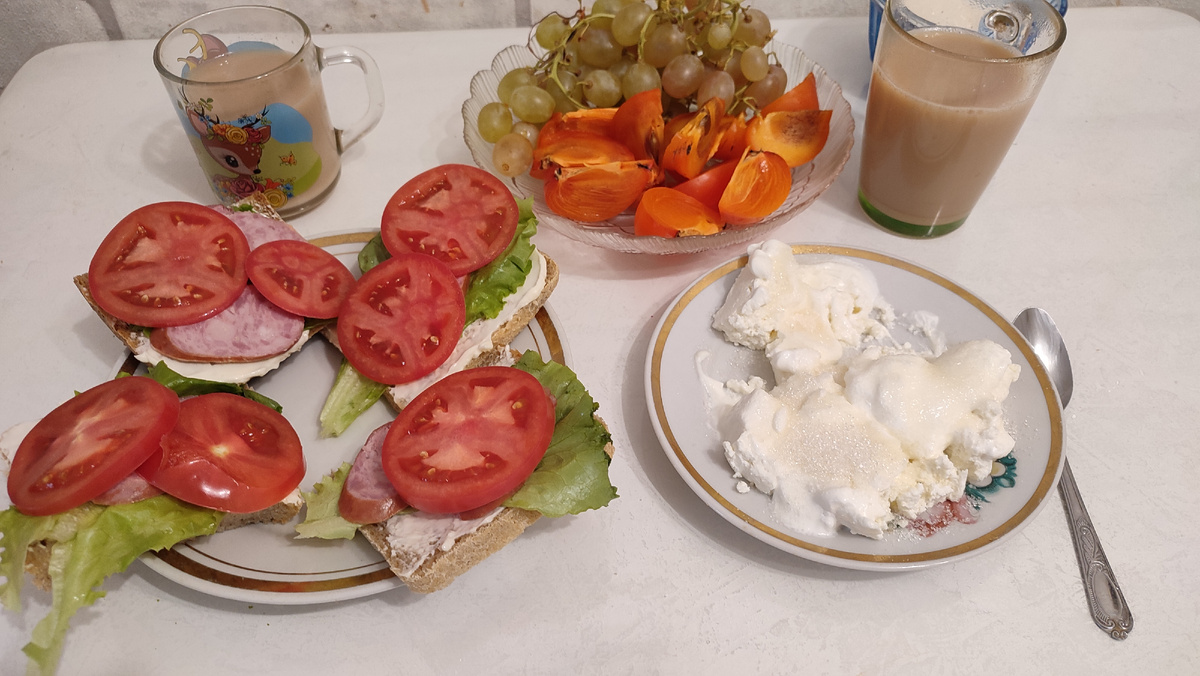 Всем приветик, мои дорогие🤗🤗🤗 Я буду работать два дня, будет не до магазина. Поэтому вчера и сегодня купили немного фруктов и овощей, чтобы разнообразить питание, пока работаю. На эти дни готовить ничего не буду. Сыну оставлю обед на плите, а вечером муж что нибудь уж приготовит. В морозилке есть полуфабрикаты. Утро было аппетитное. Кстати, ничего не пришлось готовить. Дочка сказала, что хочет сендвичи. 👌 Съела она только один. Очень даже вкусно. На хлеб намазать плавленый сливочный сыр, положить лист салата, колбаску, помидоры. Так же помыла и поставила виноград и хурму. Яблоки и апельсины поставлю потом. Так же на столе творог со сметаной и сахаром. Короче, было сытно и вкусно. Мы когда были в деревне, мама передала тыкву. Она чищеная и нарезана на куски. Хотела какую нибудь выпечку, а потом думаю, сделаю ка я лучше суп. Выпечку ведь и потом можно)) Тем более, суп то овощной, полезный. Отварила грудку. Нарезала тыкву, нашинковала немного капусты, натёрла морковь