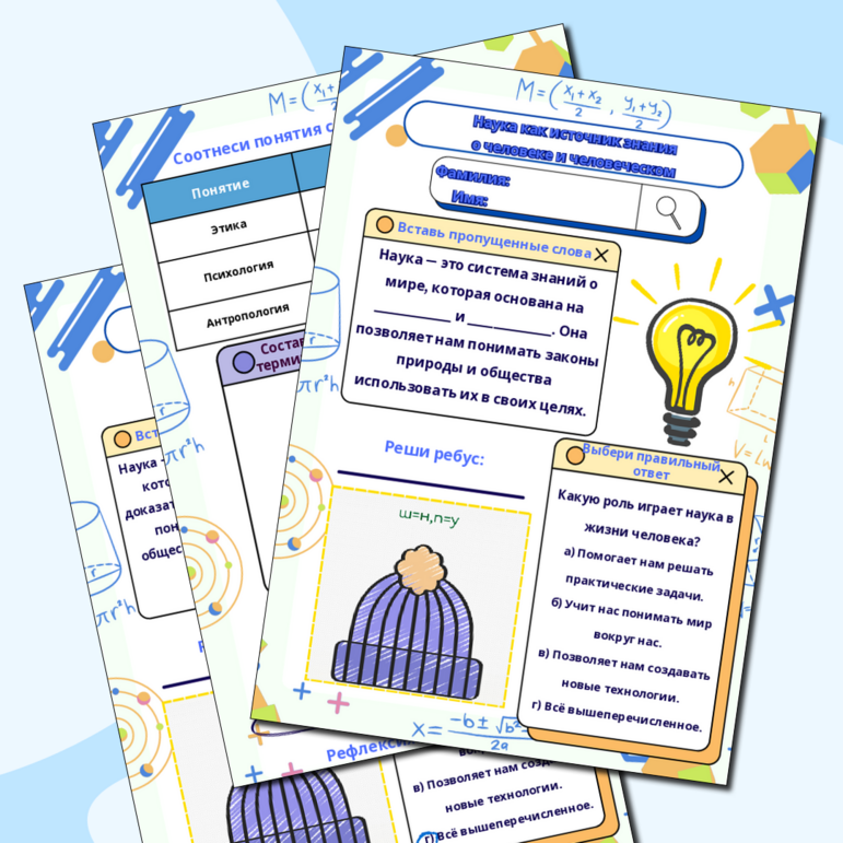 Рабочий лист предназначен для изучения темы «Наука как источник знания о человеке и человеческом» в рамках курса «Основы духовно-нравственной культуры народов России» (ОДНКР) для 6 класса. Он содержит разнообразные задания, направленные на формирование у учащихся понимания роли науки в изучении человека и его места в мире. Цели: Познакомить учащихся с понятием науки и её значением для познания мира. Рассмотреть основные научные дисциплины, изучающие человека. Обсудить роль науки в формировании нравственных ценностей. Развить критическое мышление и умение анализировать информацию. Структура: Рабочий лист состоит из нескольких разделов: Вставь пропущенное слово — задание на дополнение определений терминов. Выбери верный ответ. Реши ребус. Соотнеси понятие — упражнение на соотнесение научных дисциплин с их определениями. Составь предложение — развитие навыков формулирования мыслей. Допиши — дополнение определений и рассуждений. Преимущества: Разнообразие заданий способствует развитию